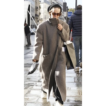 It is inspired by the coat worn by Naomi Watts as Liberty Ronson in Alls Fair. It is made of a nylon wool fabric that is very soft, lightweight, and warm, having an elegant drape and natural thermal efficiency. The high stand-collar, which surrounds the face, adds subtle sophistication in styling. The asymmetric front placket and button closing add an element of modern refinement to the classic form. With long sleeves and a soft inner lining, comfort is assured all day.