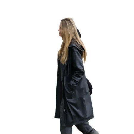 The silhouette is long and offers a long line, which is smooth and casual. A front zipper with snap button closure ensures secure fastening while allowing styling options. The hood that is attached provides more coverage and a little practical functionality without interfering with the clean design.