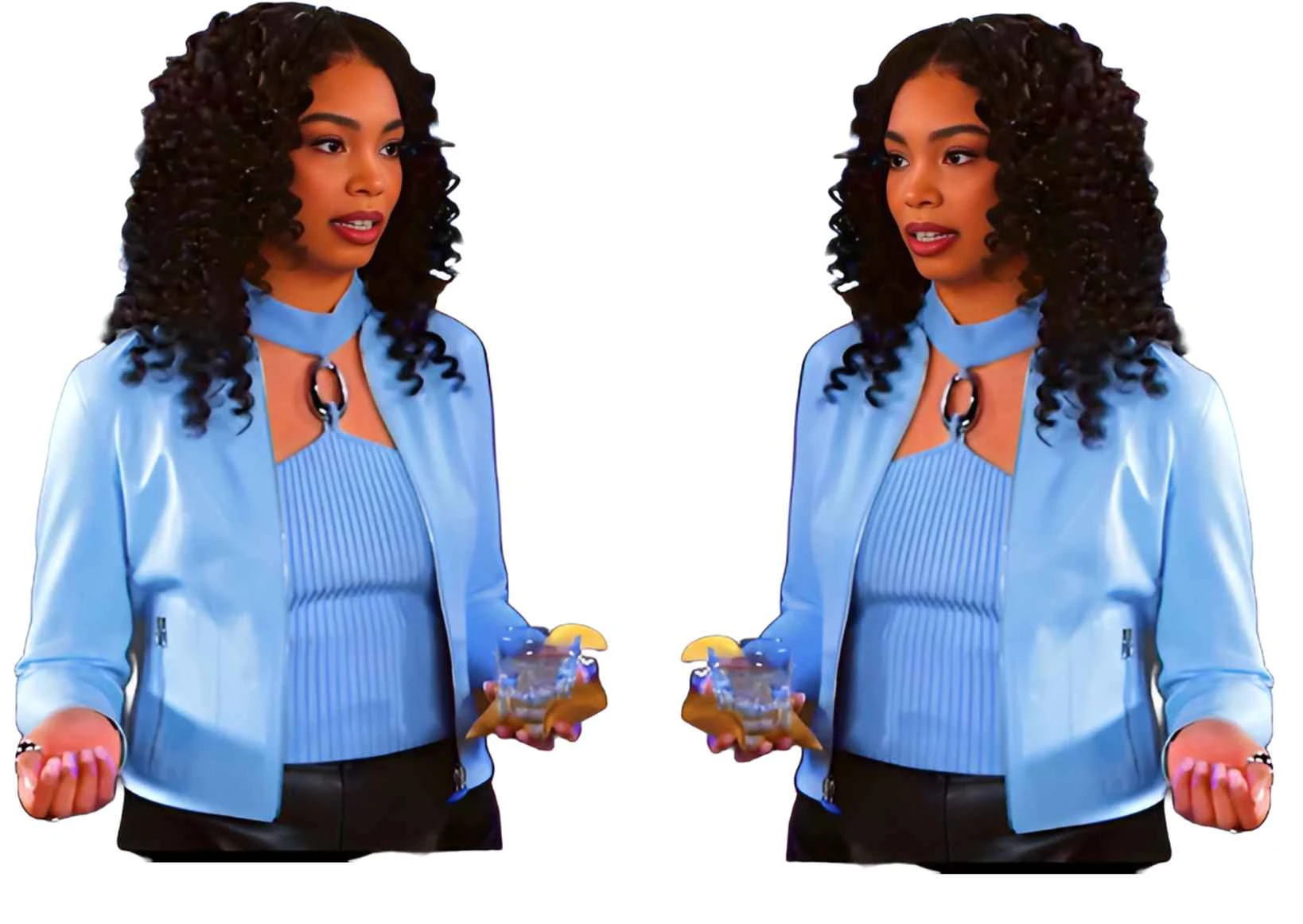 The RhonniRose Mantilla Leather Jacket is designed to meet the needs of a woman who cares about elegant style and silent assurance; it fits everyday life perfectly. The blue leather jacket provides a foundation for personal style through its combination of tailored workwear and casual denim functions. The elegant piece designed for Chelsea Richardson includes Beyond the Gates inspiration to create a combination of stylish appearance and practical use.