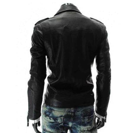 A black leather moto jacket for men is a stylish and versatile outerwear piece that is perfect for a wide range of occasions. The jacket is typically made from high-quality leather that is durable, comfortable, and stylish. The design of the jacket is inspired by classic motorcycle jackets, featuring a slim fit, asymmetrical front zipper, and wide lapels with snap closures The black color of the jacket adds a touch of sophistication and class to any outfit, making it a popular choice for both casual and formal occasions. The jacket is perfect for adding a rugged edge to a simple t-shirt and jeans, or for pairing with dressier outfits for a sleek and stylish look The leather material of the jacket is naturally insulating and can provide warmth during cooler months, while also being breathable enough for wear during warmer weather. The jacket typically features multiple pockets, including zippered pockets, providing ample storage space for small items like wallets, keys, and phones Overall, a black leather moto jacket for men is a timeless and fashionable wardrobe staple that can be worn for years to come. It is a versatile piece that can be dressed up or down and adds a touch of edgy sophistication to any outfit
