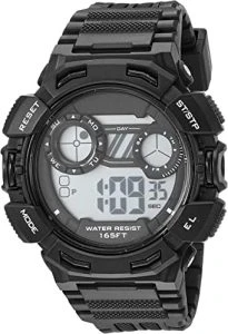 Put this black watch in your hand and create the exact look as Dieter Bravo's watch from The Bubble. The keeper made by Amazon Essentials has a metalized black resin case complemented by a black and textured strap finished with an adjustable buckle.