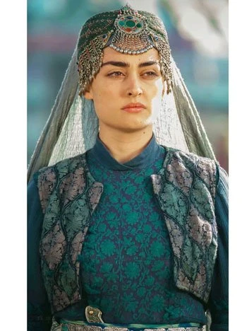 Her attire in the Ertugrul Ghazi series displayed yet more fabulously meticulous designs, including Halime's stunning traditional Turkish caftan and headdress, increasing the attractiveness of this character manifold. Her costume in this series adds to the drama and glamour of the storyline.