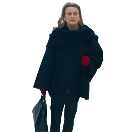 Introducing the Champagne Problems 2025 Astrid Whettnall Collar Cape Coat, a truly effortless, elegant, and modern piece for contemporary wardrobes. The black wool outerwear was inspired by Brigitte Laurent in Champagne Problems 2025 and worn by Astrid Whettnall as a stylish compromise between day-to-day usability and a slightly higher sophistication factor. The cowl collar and flowing cape silhouette manage to give that extra bit of refinement, along with the comfort factor, when heading into a meeting, meandering through the city, or out at night.