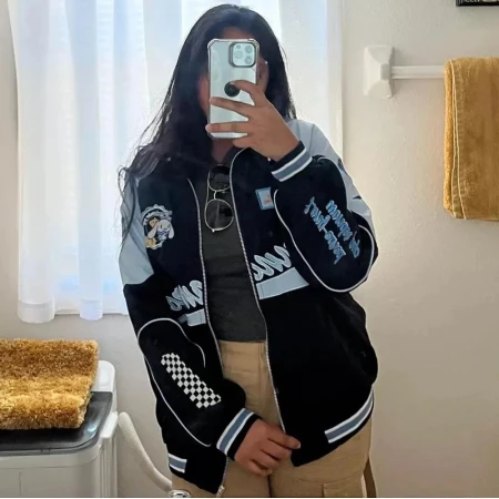 I'm a big fan of casual streetwear, so when I got this Cinnamoroll Racer Jacket, the first thing I noticed was the fabric. It's a shiny, durable parachute fabric that feels light on your shoulders but still blocks the wind—perfect for a fabulous day out.