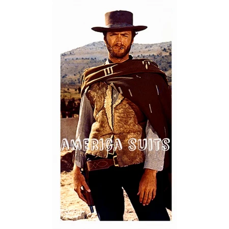 It's so hard to pick America suits favorite pieces, but this jacket has got to be it! Reminiscent of the shearling vest Tall Drink of Water Clint Eastwood wore throughout The Man with No Name Trilogy, this jacket is beyond cool!. americasuits.com proudly presents this handmade jacket at a very reasonable price. Clint Eastwood The Man With No Name Leather Jacket is also waxed once the jacket is ready and looks just like in the photoshoot. Order now at an incredible price.