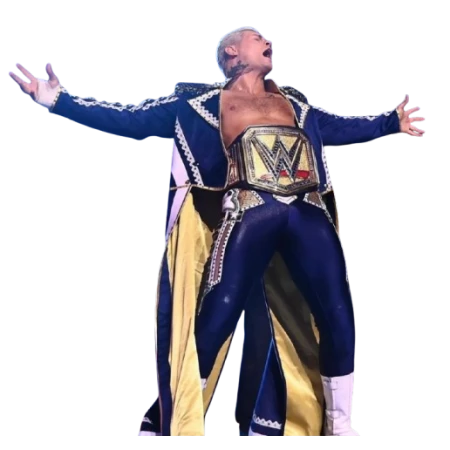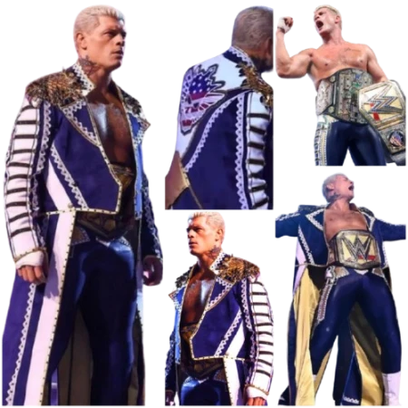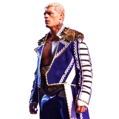 The Crown Jewel 2024 Cody Rhodes Blue & White Military Coat is the same bold piece Rhodes wore during his entrance at WWE’s Crown Jewel event. Fans noticed it immediately — the military cut, the sharp colors, the stage presence it added. Now that looks can move from the ramp to your wardrobe.