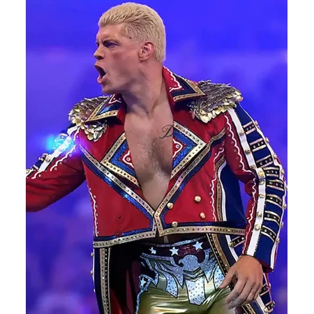 One of its kind, this Hand Made Jacket is the world of elegance and style with our Cody Rhodes Military Coat. This exquisite coat is inspired by the legendary Cody Rhodes, known for his charismatic personality and impeccable fashion sense. Crafted with utmost precision, this coat enhances your overall look and makes a bold fashion statement. Cody Rhodes Return In Royal Rumble Red Military Coat is made from high-quality faux leather and offers a luxurious feel and remarkable durability. The soft viscose lining inside ensures optimal comfort, keeping you cozy and warm throughout the day. The lapel-style collar adds a touch of sophistication, exuding a classic appeal that never goes out of style.