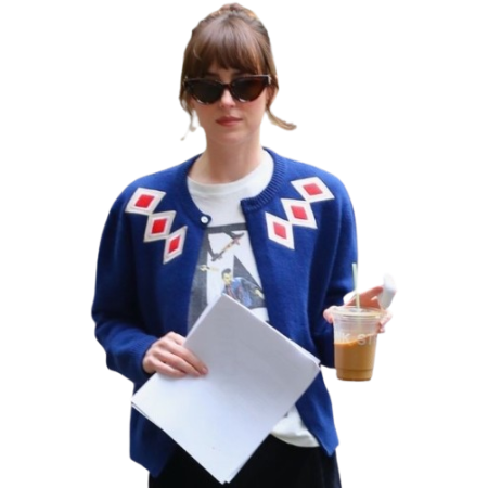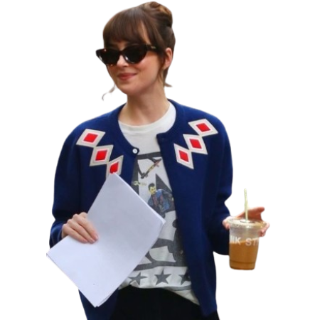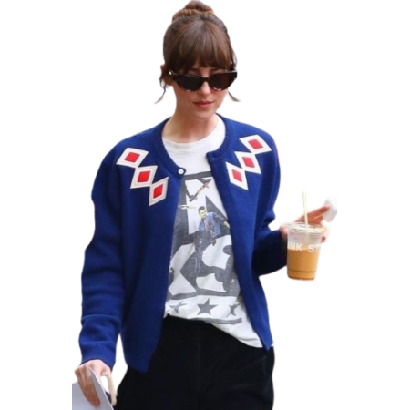 Dakota Johnson Jacket is neither very unique nor too common when it comes to the design. The deep blue color would go with a lot, be it jeans or a dress. The sharp collar, flawless zipper, and tailored fit certainly make the blue jacket say class and eloquence when one should.