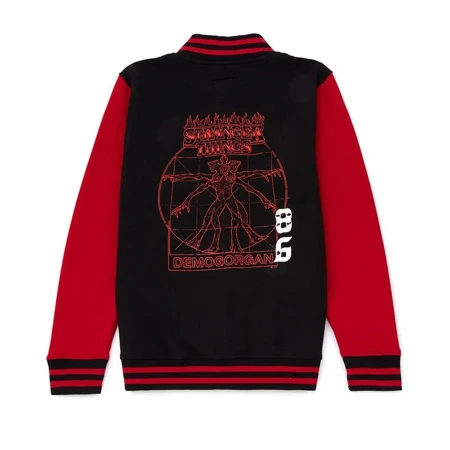 Look the part with this stylish Demogorgon Hunter Stranger Things Varsity Jacket. This classic varsity jacket features a rib-knitted stand-up style collar, rib-knitted cuffs, buttoned closure, and two waist pockets. The outside material is made of fleece fabrics and the inside is lined with viscose, making it comfortable and stylish. The jacket is red and black and is perfect for any fan of Stranger Things.