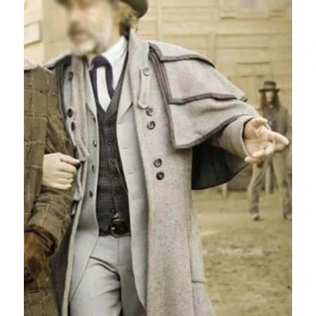 Look no further than the Django Unchained Christoph Waltz Duster Coat! This wool coat is perfect for those chilly days when you want to feel like you're the star of your own spaghetti Western. The double-breasted button closure and stand-up style collar will make you look like you mean business, while the two-sided waist and two inward pockets will keep your belongings safe and sound. The full-length sleeves with open cuffs complete the look of this coat, which is sure to become your new favorite piece of outerwear.