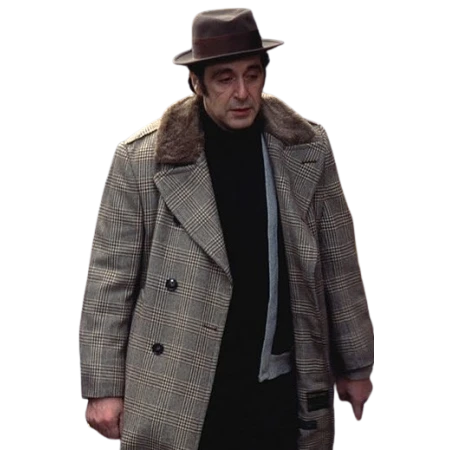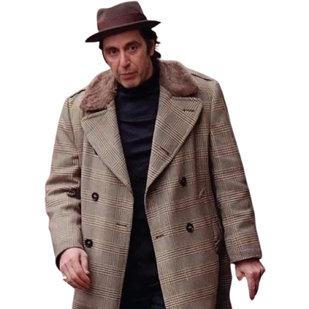 We used pure cotton material to construct this Donnie Brasco Coat and the inner is covered with a soft viscose lining to make it comfortable. It is grey and has a checkered pattern all over the coat. To protect you from chilly days, a shearling lining with a wide-notch lapel collar in brown is also present.