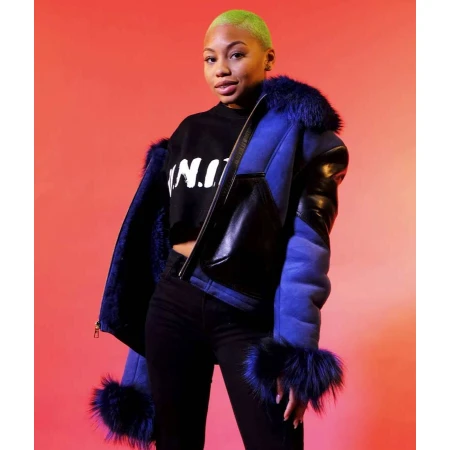 Introducing the Elizabeth Sheepskin Shearling Leather Jacket with Blue Faux Fur, the ultimate combination of warmth and style for the cold winter season. This jacket is designed to keep you cozy and fashionable, with its stunning features that are sure to make a statement. The Elizabeth Sheepskin Shearling Leather Jacket is crafted from high-quality suede leather, providing a luxurious and soft texture. The jacket features a beautiful color combination of black and blue, creating a visually appealing contrast that stands out from the crowd.