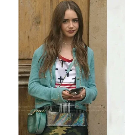 Lily Collins Emily In Paris Emily Blue Chain Trim Cardigan
