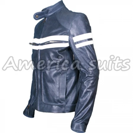 Americasuits Offers a great deal to get this beautiful . The Fight Club Brad Pitt Blue White Leather Jacket is sophisticated design of the jacket is approved in a well-known movie which was released in 1999 named as Fight Club. According to customer desires and fashionable statement, it is extremely an elegant product and comfortable to wear it. It has extensively unique specifications which draws the attention of all. Moreover it has elegant features, including YKK zipper for front closure, Button shutting collar, Slant pockets with zip, White straps on sleeves and Chest, Front Zip Pocket and Zip on Sleeves as well as nice and sophisticated stitching and finishing.