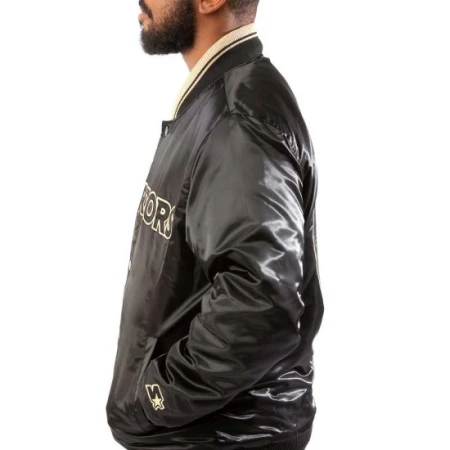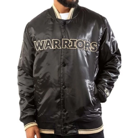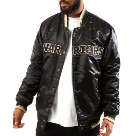 Step up your style game with the Golden State Warriors Bomber Jacket. Made from high-quality satin material, this jacket exudes a sleek and sophisticated vibe. The black color adds a touch of elegance and versatility, allowing you to pair it effortlessly with any outfit. Whether you're heading to a game night or simply want to showcase your love for the Golden State Warriors, this jacket is the perfect choice. Featuring a rib-knitted collar and cuffs, the jacket ensures a comfortable and snug fit. The buttoned closure adds a classic touch and allows for easy wearing and removal. Adorned with logos on the front, back, and sleeves, this Golden State Warriors Bomber Black Jacket proudly displays your allegiance to the Golden State Warriors. The attention to detail is evident in the craftsmanship, making it a must-have for any true fan.
