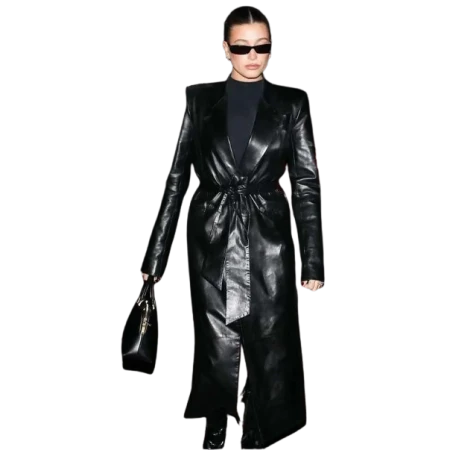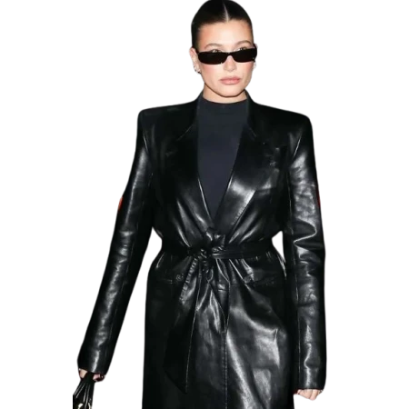 least, it is neutral, formal, and comfortable so those shoes can be worn during the working week and on special occasions. Stitched from the finest fabric material in line with the current fashion markets, Hailey Rhode Bieber 2024 Black Belted Leather Trench Coat is well designed to keep you warm all season and well past it. First, the application of materials will make the clothes soft and comfortable to wear and the construction of the clothes will make them last long. It has broad shoulders, it is wearable al through especially during the early or late season.