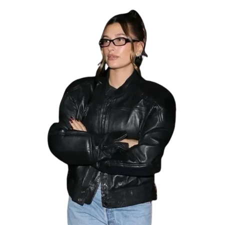 There are always gaps that accessories are meant to fit into the beauty of your life. If you need an upgrade, then fill them with the Hailey Rhode Bieber Black Leather Bomber jacket because it is as versatile, full, and comfortable as the look. This is a perfect look-alike imitation of Hailey Bieber's jet- black leather with an added option of a slightly oversized fit, although the jacket is designed to be