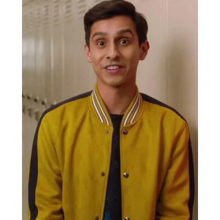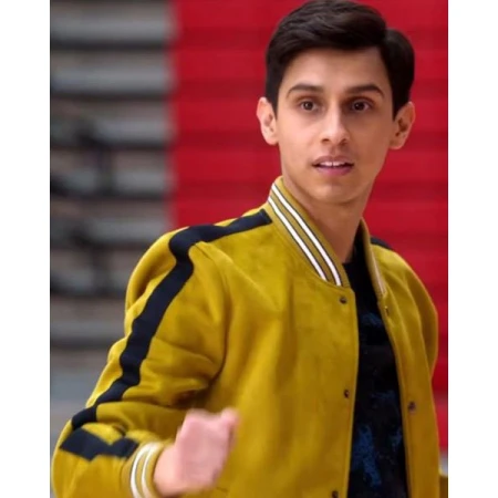 This unique color High School Musical Jacket is crafted from suede leather material in a soft mustard yellow color. Inner has a viscose lining. It has a snap front closure. Bomber Jacket has black strips on the sleeves which makes this jacket more amazing. It has a rib-knitted collar as well as hemline. Long and fitting sleeves with open hem rib-knitted cuffs are also present. Furthermore, It has a front waist and inner pockets. Make this Yellow and Black Jacket yours.