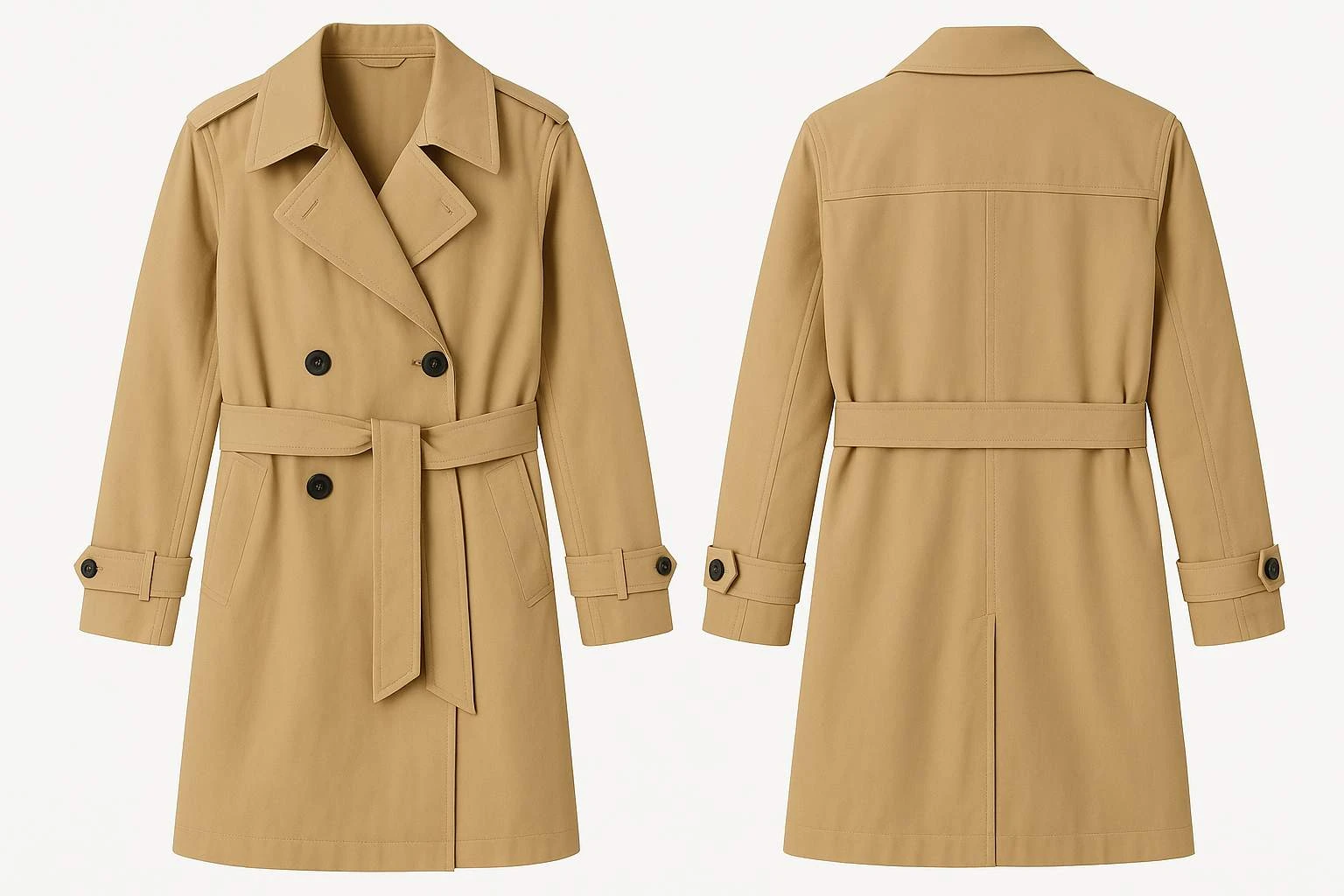 - Front: Double-Breasted Button Closure with Belt