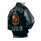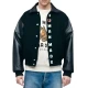 Made of wool body and leather sleeves, this black varsity jacket is a good balance of texture and durability. The wool gives it warmth and structure. It has leather sleeves that provide strength and contrast.