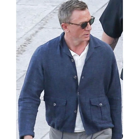 The No Time To Die Jacket comes in a timeless blue color, suitable for any fashion style. It has a smooth viscose lining and is made of soft, pure cotton. The jacket features a vintage-style shirt collar and a button fastening front closing. For a sophisticated look, the full sleeves have open hem cuffs. Additionally, the James Bond Jacket has two flap pockets on the waist side. It is suitable for both casual and formal gatherings. It's a great time to purchase this jacket, as the film has not yet been released. Place your order now!