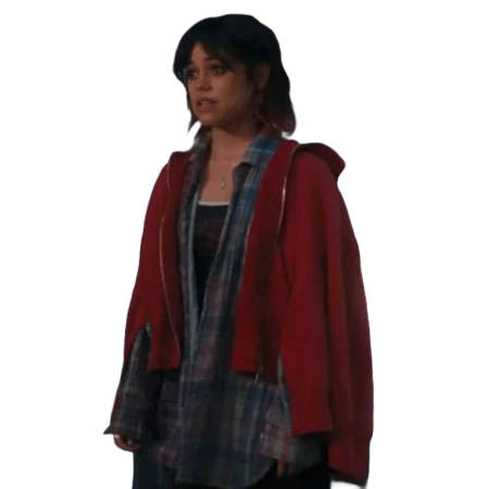 The design blends youthful streetwear energy with laid-back confidence. Made from soft fleece or cotton blend, it features a clean front zip closure, relaxed drop shoulders, and a ribbed hemline that gives it a structured, modern feel. Whether layered over a plaid shirt or paired with jeans and sneakers, it mirrors Jenna Ortega’s effortlessly cool vibe in the film.