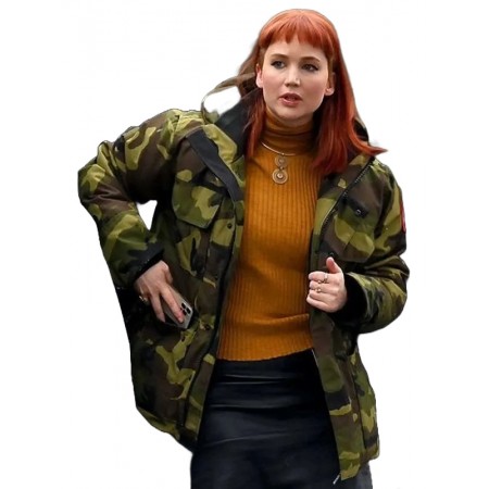 Be a fighter in Jennifer Lawrence's Don’t Look Up Camouflage Jacket to change the world. Don’t Look Up is a great onscreen film about astronomical events and worldly crises. A touch of dark humor is also added to make the plot more interesting despite being an intellectual science fiction genre. The glamorous Jennifer Lawrence plays the main lead character, Kate Dibiasky.