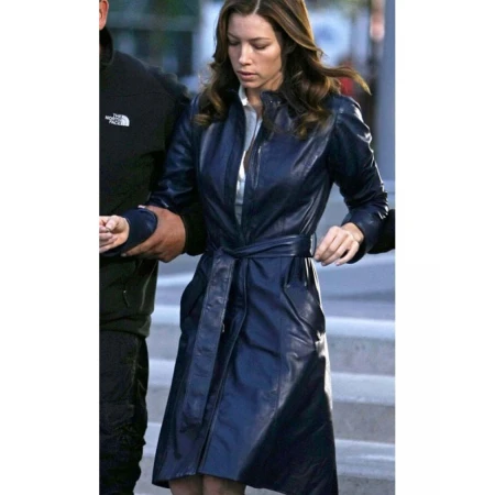 - Jessica Biel Blue leather coat