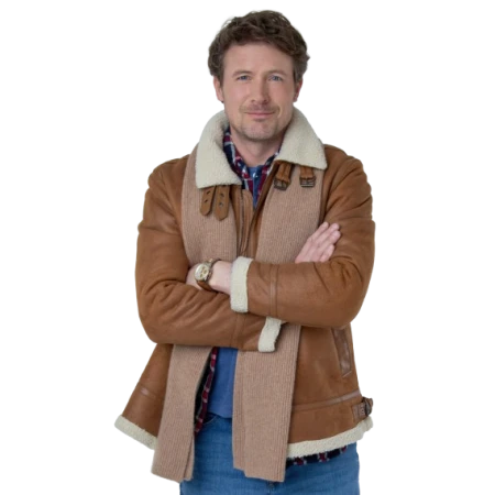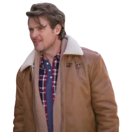 Inspired by John Reardon’s laid-back warmth in Believe in Christmas, this Ethan brown shearling jacket gives off those wholesome, woodsy vibes. The brown leather feels soft and lived-in, with a fit that moves with you. That faux fur collar? It’s cozy, looks great, and keeps you warm without trying too hard.