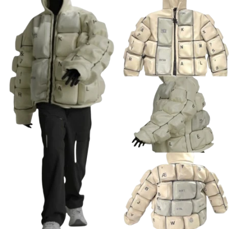 This one’s for the ones who like to stand out without shouting. The Keyboard Puffer Jacket has that weird-cool energy, something between futuristic and throwback. It’s padded, bold, and shaped like you planned your outfit.