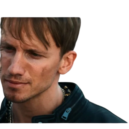waiting for Lenart again in the frames, wearing a black leather suit with