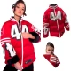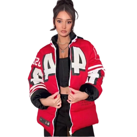 team. This jacket comes in red, and the logo of the San Francisco 49ers has