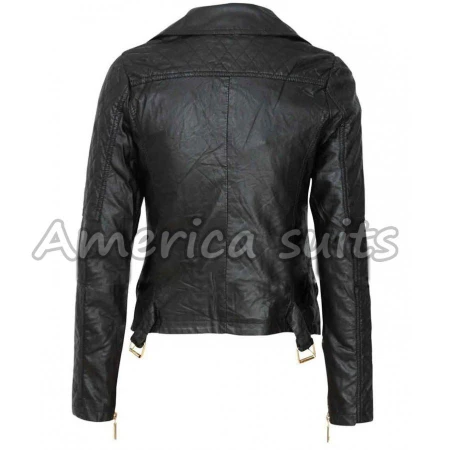 The clothing is to a great degree tasteful. The marvelous black color and the sewed outline components consolidate so well together that they make this Ladies Imitation Quilted Black Leather Biker Jacket a magnum opus. Women's Black Leather Biker Jacket is created with imitation or genuine leather and has polyester inside. You will basically begin to look all starry-eyed at the craftsmanship and the consideration that has been given to make this Ladies Imitation Quilted Biker Black Leather Jacket. With an extremely up-to-date score shading with zip conclusion and knitted outline components on the shoulder will make you without a doubt shrewd. It contains four askew zipped pockets. Fitted stitched sleeves with zipper sleeves look exquisite. For modification, the belt is on the waist side. This Quilted Leather Biker Jacket has turned into a definitive arrangement for ladies around the world.