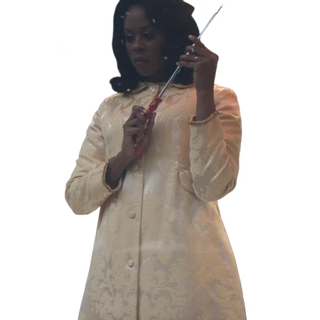 The storyline is about two main leading characters who intersect with each other as life throws an incidental murder mystery. As the show is based on old times, Moses Ingram is given styling inspired by classic feminine looks. A material of fleece embedded with floral work is crafted in its finest form to achieve the look of Moses Ingram Coat.