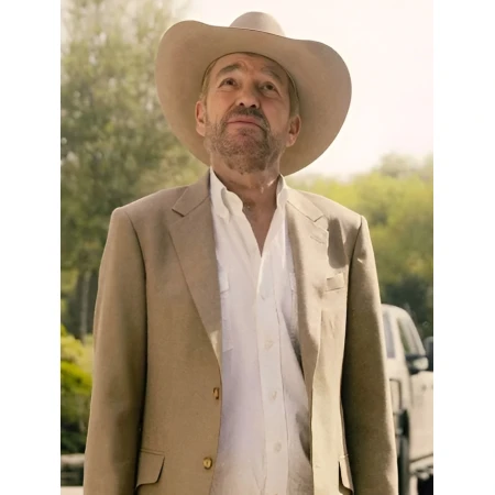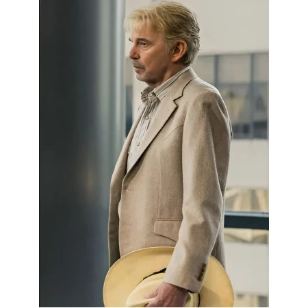 The beige blazer takes its design from Landman, which Billy Bob Thornton uses to portray Tommy Norris and it features suiting fabric that creates a smooth, structured appearance. The blazer maintains its shape throughout the day because its viscose lining provides breathable comfort.