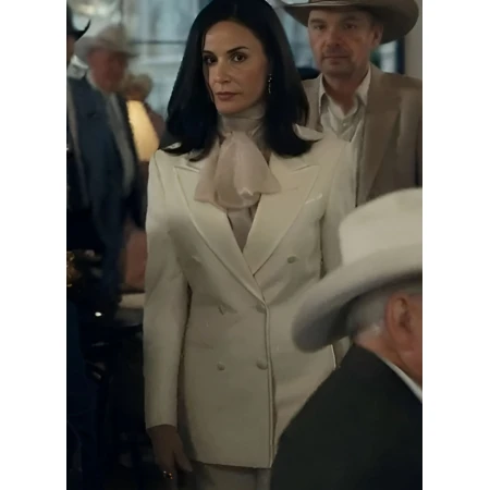 The white blazer was made for women who want to achieve a serene, stylish look through their clothing. The design of this piece is inspired by Demi Moore's Landman S02 outfit, styled by Cami Miller. The product's design supports personal expression through its clean lines, providing comfort and balance while maintaining a professional look year-round.