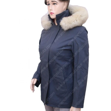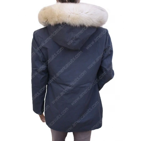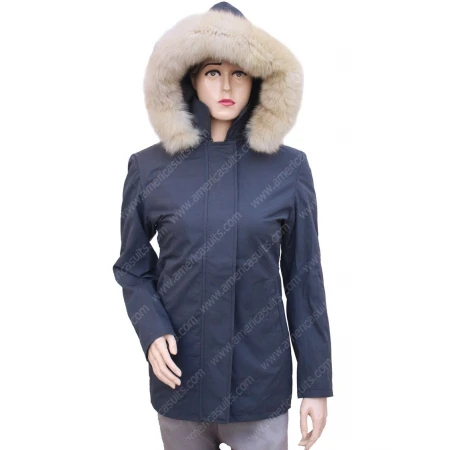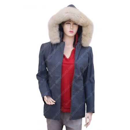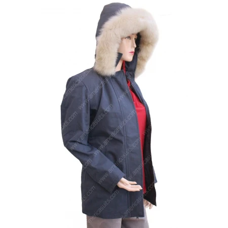 Isabela Moner Coat is made from cotton material. The inner side of the jacket has a viscose lining. The unique feature of this women's coat is that it has a shearling lining hoodie. It has stand up style collar. It also has a zipper closure on the frontage. Let It Snow Coat has full sleeves with open hem cuffs. It also two side waist pockets. Its dark grey color is another unique feature of this jacket. Drop your order now from americasuits.com.