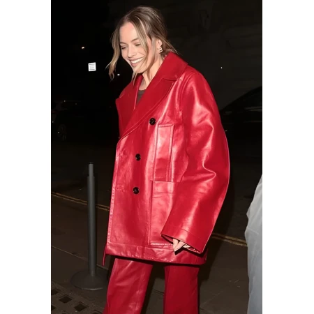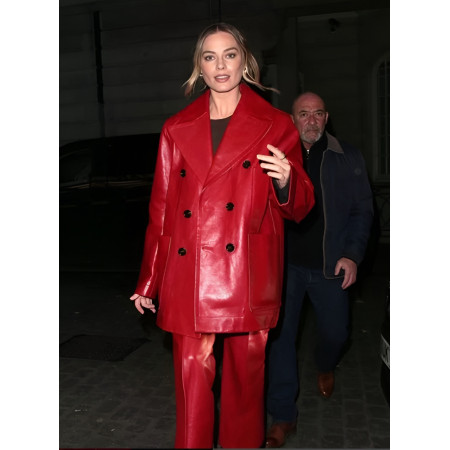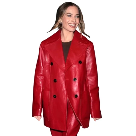 The Margot Robbie Glossy Red Leather Pant Coat, featuring a rigid, sculpted faux leather construction, is one for the discerning buyer. It ignites Hollywood glamor, perfect for an evening event or as a bold statement layer with a casual outfit. One simply picks it up, with the audacity of a starlet, when one feels able to shine through.