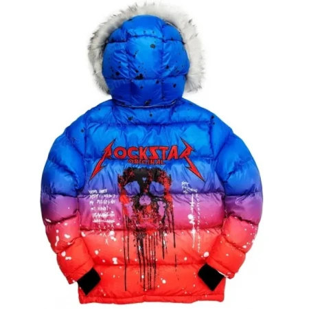 The Gradient Puffer jacket is available in red and radient blue colors which