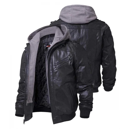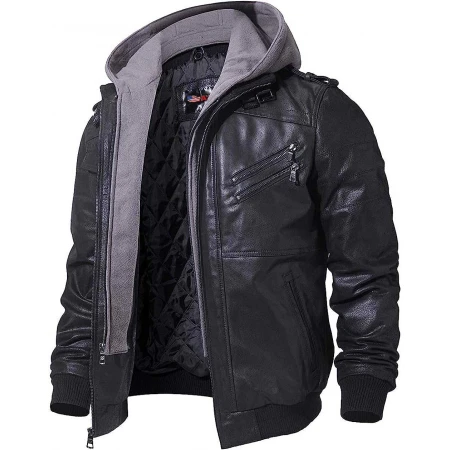 Men's Leather Motorcycle Black Hooded Jacket