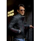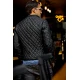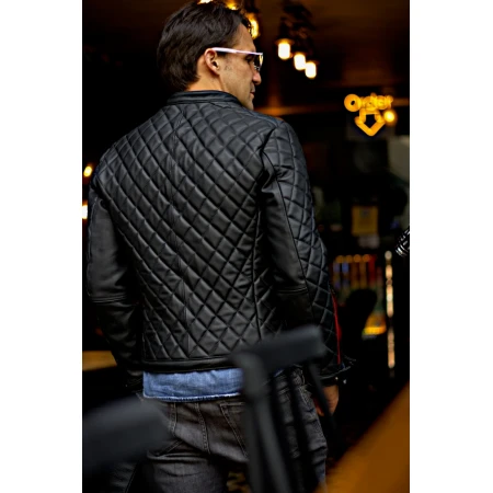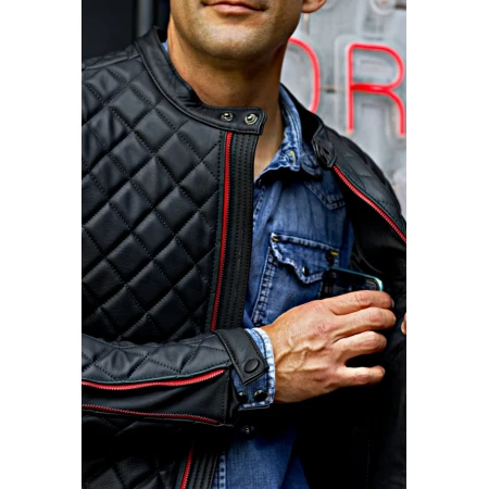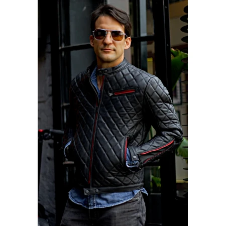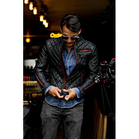 Men`s Quilted Black Leather Jacket with Red Zipper