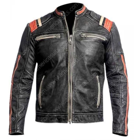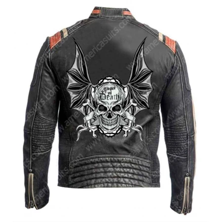 The Mens Black Leather Jacket with Zippered Cuffs will give you a more impressive appearance to grab the attention of the whole crowd. Men's Black Leather Jacket is made up of from genuine leather and faux leather so you can pick your favorite material that suits you perfectly. The back of the jacket has a skull print with the text "angel of death". And it also has long sleeves with zippered cuffs. The front of the black leather jacket has four pockets and smooth zipper closure for perfect slim fitting. The red and white stripes of this leather jacket make it more eye-pleasing. Place your order and grab trendy apparel at the sale price. See more at America Suits