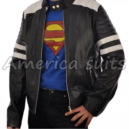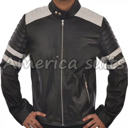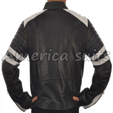 The Men’s Fight Club Mayhem Style Black Leather Motorcycle Jacket pays homage to the unforgettable style worn by Brad Pitt in Fight Club. Designed for fans of the movie and lovers of bold fashion, this jacket combines classic biker functionality with a screen-accurate look that stands out. The deep black exterior is contrasted by crisp white panels on the shoulders and arms, giving it a striking yet timeless character.