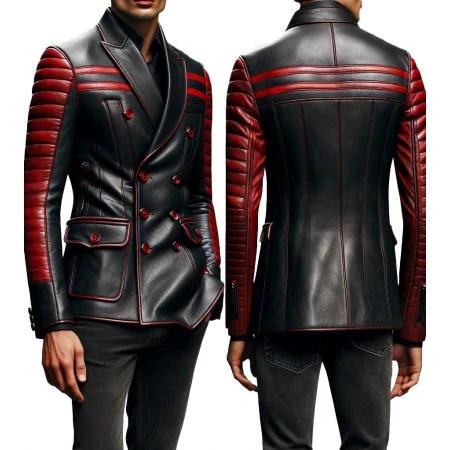 The blazer is a perfect blend of formal and sporty elements. The black base with eye-catching red accents, particularly on the sleeves, creates a unique look. The quilted design in a rich red color on the sleeves contrasts sharply against the black, adding a sporty touch. The blazer is double-breasted with a structured shoulder, enhancing its tailored appearance and giving it a formal edge. Red stripes at the cuffs and along the seam lines on the back contribute to the garment's elegant and sporty aesthetic. The collar and lapels are sharp, further enhancing its formal appeal. Additionally, detailed red highlights bordering the pockets and the edges of the blazer, along with red buttonholes, complement the overall design. This piece merges traditional tailoring with bold color contrast, creating a classic and modern look.