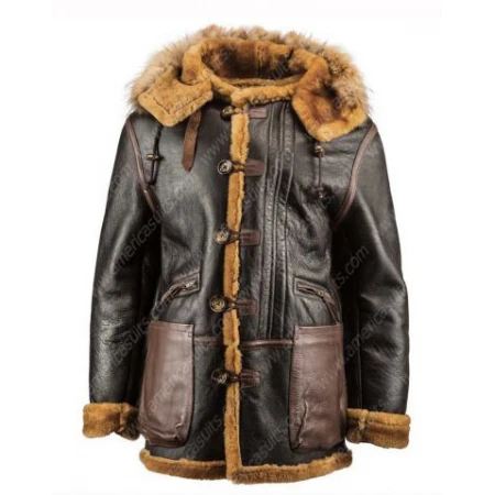 The Mens Shearling Winter Coat is an awesome coat. This shearling leather jacket is simple yet fancy and it should be owned during winter. The coat features a classic button closure, a shearling hood, and has dark brown lining with warm fur inside. It will keep you cozy during the cold months of winter while still making you fashionable.