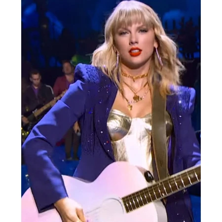 When it comes to Miss Americana Taylor Swift Purple Blazer, that Taylor Swift wore in an above-mentioned film is manufactured from a blend of sequin material. The collar is notch lapel style. Miss Americana Coat comes in a unique purple color. The shining exterior is exactly that which you want for a pop star look. The front open style allows wearing any of your favorite outfit underneath the blazer. One more thing, a viscose lining is present on the inner side of Purple Blazer for a soft touch. This is perfect for any of your important occasions as well as for the party wear.