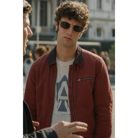 The modern, sleek appearance of the jacket comes from the shirt-style collar with a smooth front zipper, giving this jacket that added versatility with twin functional front pockets for everyday use. Perfect for transitional wear from fall into winter, layered or just worn alone in spring, the long sleeves give it just that versatility. The deep maroon color hints at cinematic magic under the scheme of this jacket and never actually goes into costume-like territory, yet may lend to the incredibly iconic but relaxed nature of the Dominic Sessa character on screen.