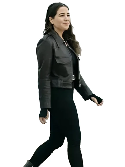 The black leather jacket for women takes design cues from Audrey Esparza's character in Power Book IV. The jacket provides wind protection through its outside material, which delivers soft comfort through its inner lining and two usable pockets.