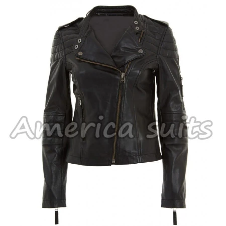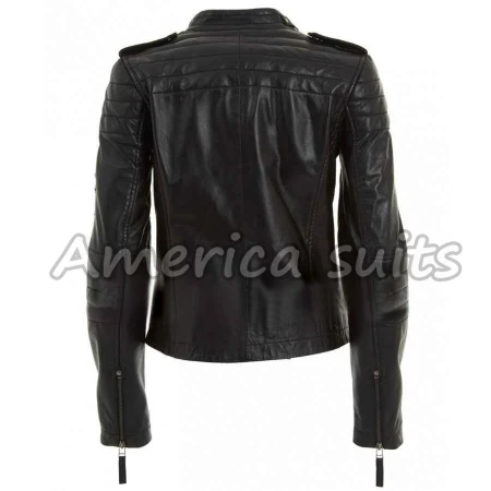 Women we exhibits you this exquisite cowhide coats with a tasteful new search for your character. Brilliant Quilted Womens Black Leather Moto Jacket is a picture of element simplicity. Genuine cowhide has been used in the amassing of this remarkable coat. Inside there is a gooey coating to achieve the most astounding nature of solace. The stitched example on shoulders and arms gives a flawless look. Select your demanded Black Leather Jacket from AmericaSuits.com.