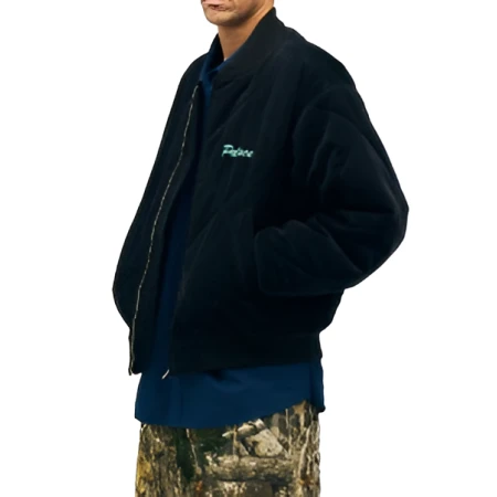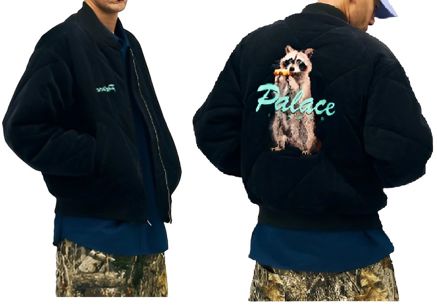 This is a jacket inspired by the Palace Spring 2026 Streetwear collection. It is made of high-quality black material that is not luxurious to touch but rather elegant due to its matte finish. It is also lined with a light material that makes it comfortable to wear against the skin, thus ideal for spring and autumn wear.